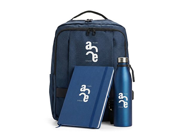 Este conjunto foi desenvolvido para profissionais que buscam máxima performance e organização em sua rotina. Unindo uma mochila tecnológica de alta capacidade, uma garrafa com acabamento metalizado e uma caderneta clássica, o kit oferece a solução completa para o ambiente de trabalho moderno e viagens de negócios.
