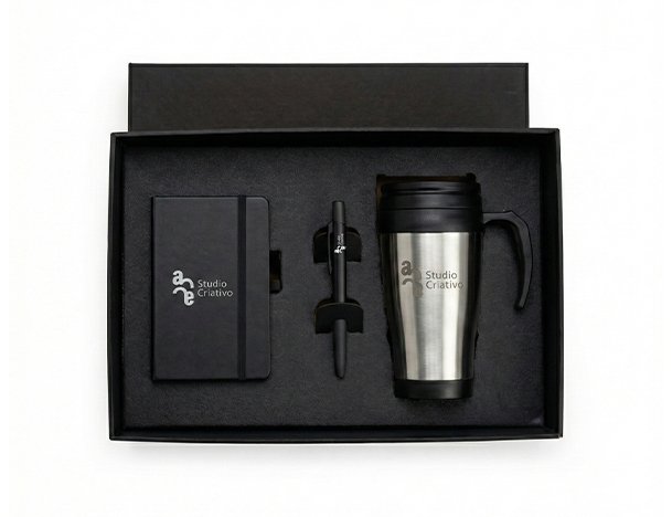 Kit composto por caneca em polipropileno preto revestida em aço inox escovado; caderno para anotações preto com capa dura e caneta esferográfica em ABS preta.